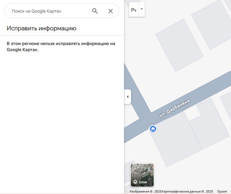 ეს კონტრასტი განსაკუთრებით ნათელია Yandex Maps-ის შემთხვევაში: იქ ნებისმიერ მომხმარებელს შეუძლია დამოუკიდებლად შეიტანოს ცვლილებები — დაამატოს ქუჩა ან შეასწოროს სახელი. მართალია, ცვლილებები განიხილება და მაშინვე არ ჩანს, მაგრამ ამას რამდენიმე დღე სჭირდება, თუმცა სისტემა მუშაობს. Google Maps-ში ეს ინსტრუმენტი არ არსებობს. ახალქალაქში რედაქტირება დახურულია, და შეცდომის გამოსწორების ნებისმიერი მცდელობა იწვევს შეტყობინებას: „ინფორმაცია არ შეიძლება რედაქტირდეს ამ რეგიონში“. რაც შეეხება სახლის ნომრების მისამართებს, სიტუაცია კიდევ უფრო უარესია: ისინი არ არის არც Google-ში და არც Yandex-ში.