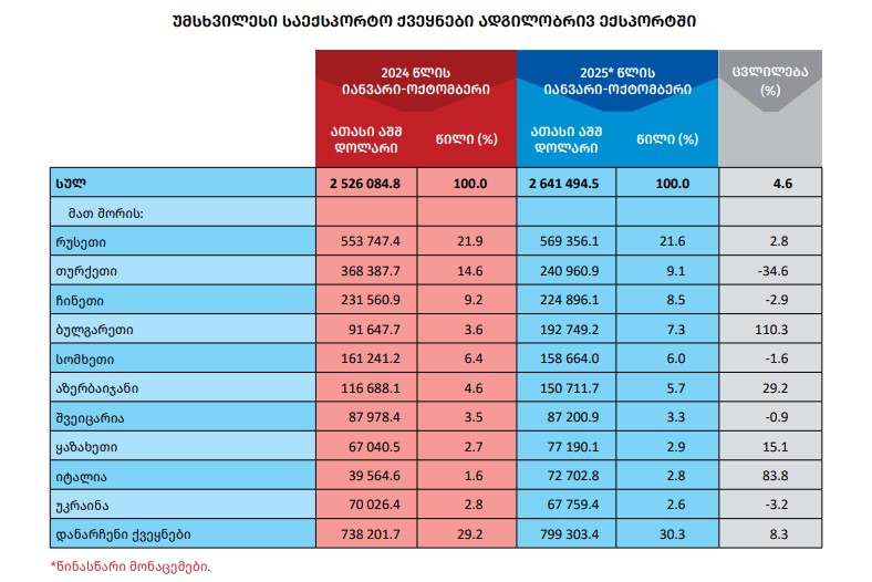 გარდა ამისა, სტატისტიკის სამსახურის მონაცემებით, ათი უდიდესი ქვეყნის წილი საქართველოს მთლიან შიდა ექსპორტში 2025 წლის იანვრიდან ოქტომბრის ჩათვლით 69.7%-ს შეადგენდა.